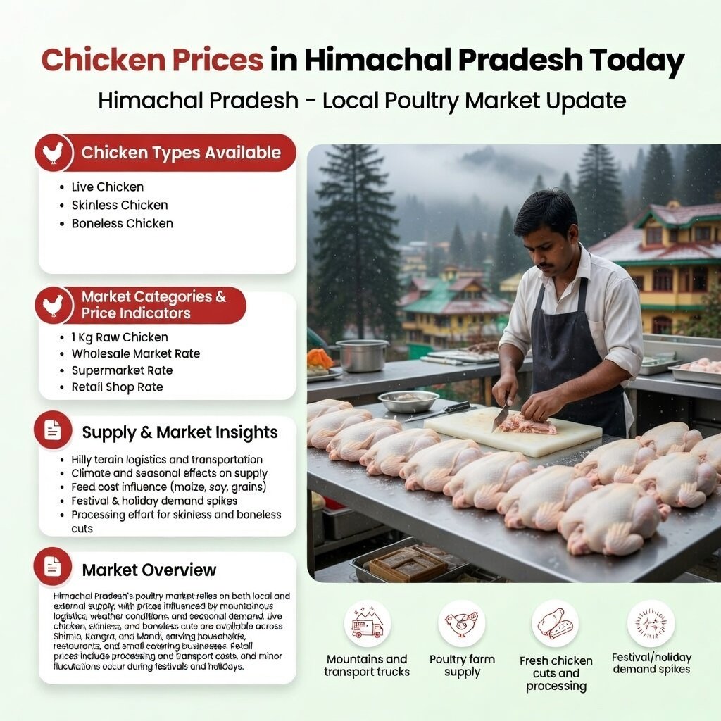 The chicken is at ₹160, ₹200 for Skinless & ₹210 for Boneless. The poultry market in the hilly state of Himachal Pradesh depends on the requirements of the farm, along with logistics and agricultural needs. From Shimla to Kangra and Mandi, relative rates of live chicken and processed cuts are important for households, vendors, and restaurants as well.