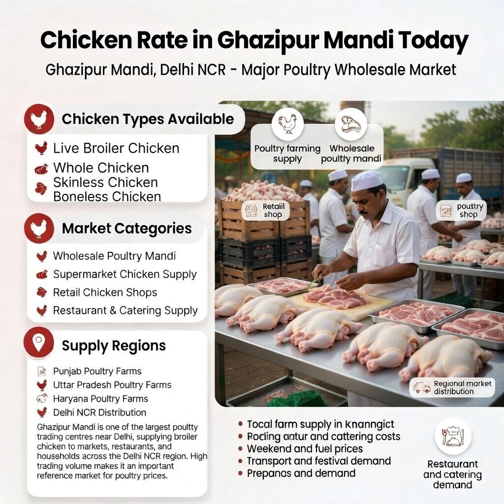 Chicken is one of the most basic and affordable sources of protein for thousands of households, hotels, and restaurants in the entire NCR area, especially Ghazipur Mandi; current prices reflect equilibrium supply-demand, so customers can expect minor fluctuations caused mainly by seasonal trends, feed prices associated with their markets, and transportation costs. Ghazipur continues to serve as one of the largest and busiest chicken markets in the region due to growing urban demand and increased food companies. Hence, suppliers and buyers alike must keep updated with daily chicken rates for price and purchase decisions in this changing market.