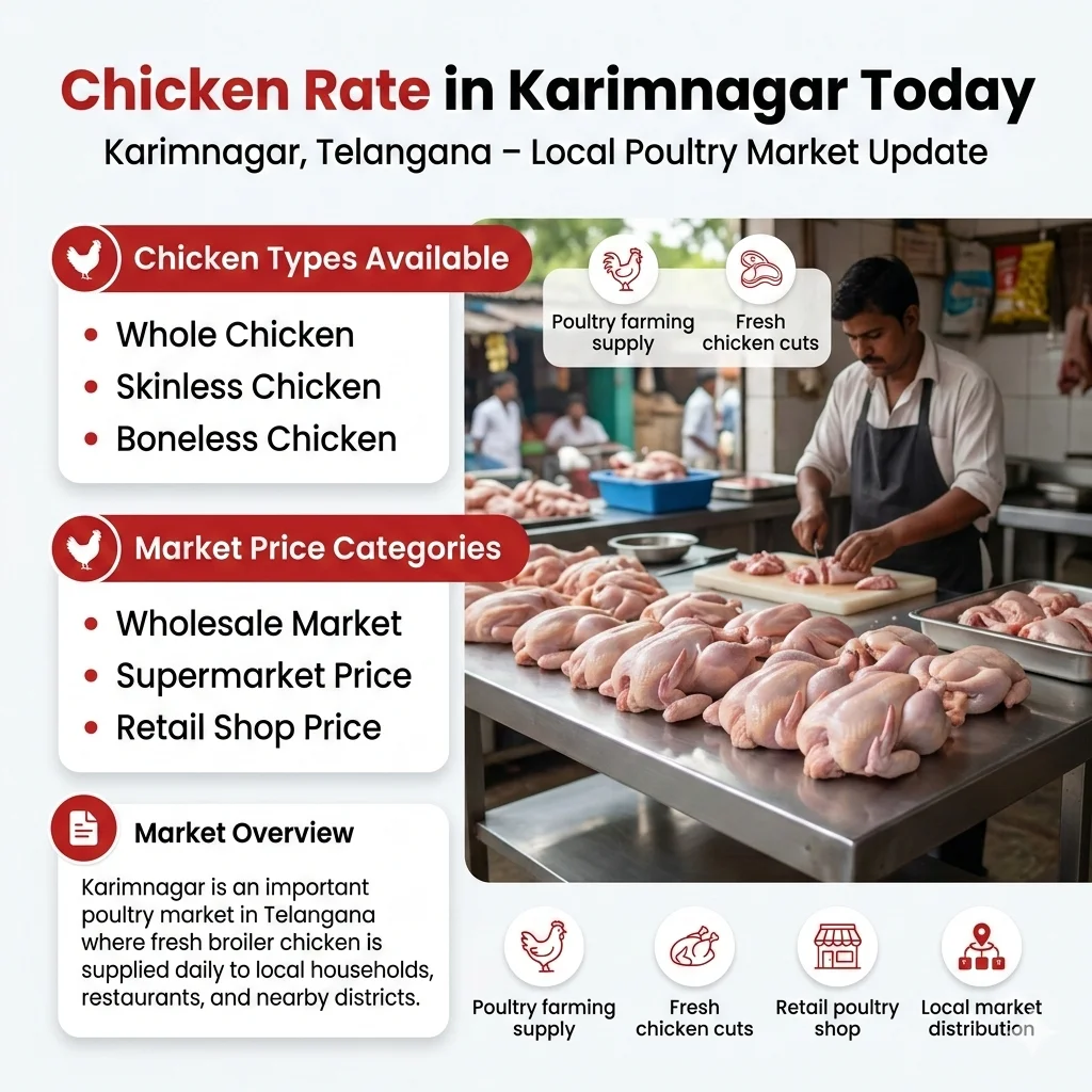Karimnagar, located in Telangana, is an emerging poultry market that connects nearby districts with a fresh chicken supply. Today’s broiler chicken prices in Kakinada show live chicken at ₹160/kg, skinless at ₹200/kg, and boneless at ₹210/kg, with boneless cuts commanding a slight premium.