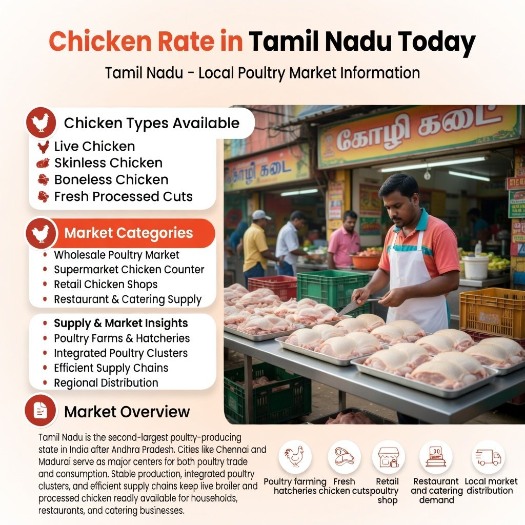In Tamil Nadu, poultry farming is a significant industry in India; after Andhra Pradesh, it is the second-largest poultry-producing state. Cities like Chennai and Madurai are the main centers of livestock and food. Nowadays rate of live chicken is at ₹160, ₹200 for Skinless chicken & ₹210 for Boneless chicken.
