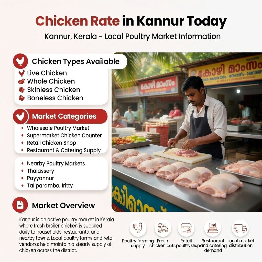 Today’s Chicken Rates in Kannur Live chicken costs ₹160 per kg, regular chicken is priced between ₹160–170 per kg, skinless chicken ranges from ₹190–200 per kg, and boneless chicken is sold at ₹210 per kg. Due to daily fluctuations in poultry demand and supply, chicken rates in Kannuar can be different across retail shops, wholesale markets, and local vendors. Here detailed update on the current chicken prices in the city.